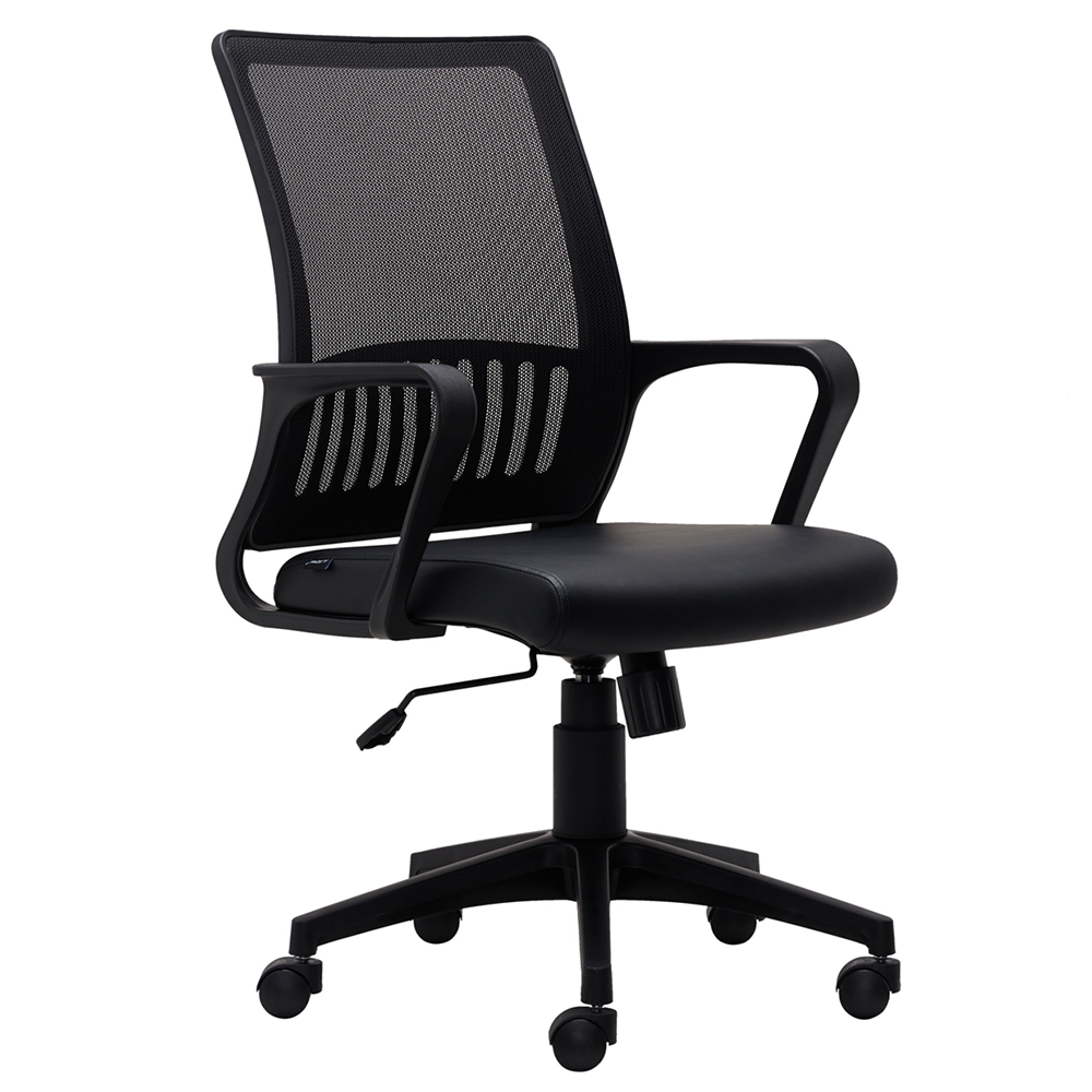 The chair back is made of high-quality plastic frame covered with special mesh fabric, the cushion is upholstered in durable fabric or synthetic leather, the load-bearing plastic arms, the swivel base with adjustable height, and smooth mobility.